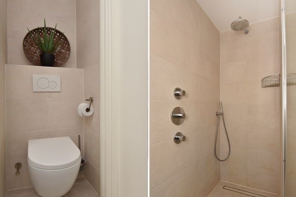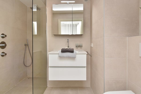 De moderne badkamer is voorzien van een toilet, wasbak met lades, spiegelkast en een inloopdouche.