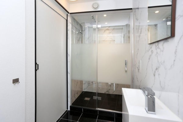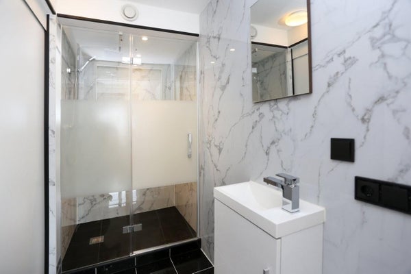 The large bathroom is accessible from the hall or from one of the bedrooms and features two sinks, a shower, toilet, and bathtub. The second bathroom, recently installed, has a spacious shower, sink, and a sliding door leading to the washing machine connection.