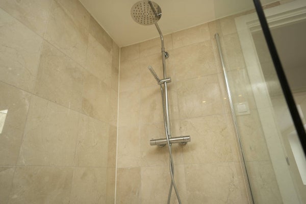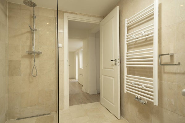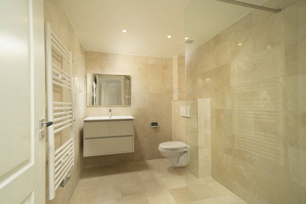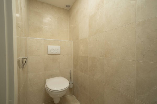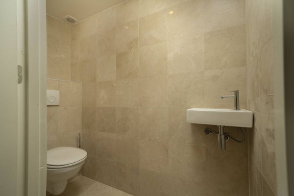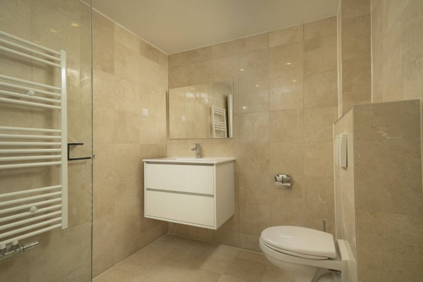 Badkamer is voorzien van luxe inbouw douche, wastafel met onderkast, handdoek radiator en tweede toilet.