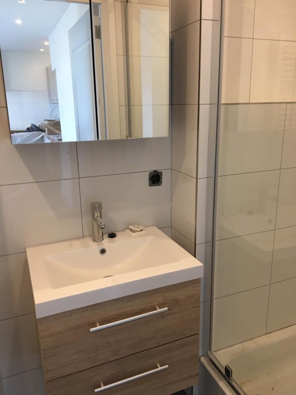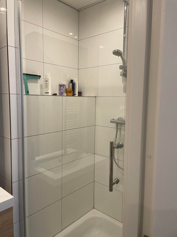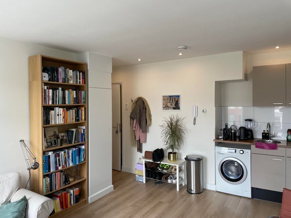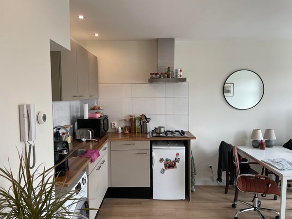 Mooie woonkamer met open keuken slaapkamer aan de voorkant en mooie badkamer.