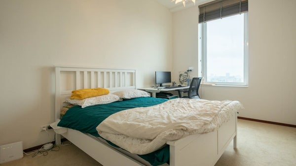 Boven het Stadsdeelkantoor aan de Leyweg is op de 11e verdieping van de 'Leyster' dit prettige appartement beschikbaar. De gezamenlijke entree op de begane grond geeft middels twee liften toegang tot de verdieping waar toegang is tot de woning zelf. Deze komt uit in de gang waarvandaan alle ruimtes, waaronder een separaat toilet, te bereiken zijn. De woonkamer is, net als de twee slaapkamers, met bijzonder hoge plafonds, veel ramen en moderne keuken met vaatwasmachine, combi magnetronoven en koel- inbouwvriezer. Ook is er een keramische kookplaat en RVS afzuigkap. Tevens is er een ruime berging is bereikbaar vanuit de keuken. In de woning zelf is een technische ruimte met aansluiting voor was- en/of droogmachine. De badkamer is netjes en voorziet in een separate douche cabine en dubbele wastafel met spiegels. De woning wordt kaal verhuurd en is bijzonder gunstig gelegen met openbaar vervoer als bus en tram op loopafstand alsmede alle winkels voor de dagelijkse boodschappen. Afname van een privé parkeerplek in de garage is mogelijk voor € 60,- per maand.