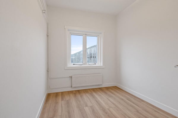 Entree op de begane grond, trap naar 1e etage, ruime hal met CV-kast, toilet, aan de voorzijde een fraaie woonkamer met ensuite deuren naar de achterkamer. Twee slaapkamers met veel lichtinval, ruime badkamer met inloopdouche, keuken met gasfornuis.