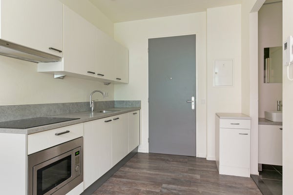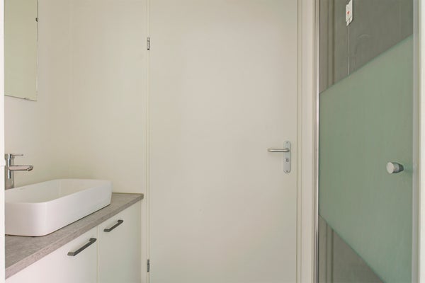 De luxe, moderne keuken bevindt zich in het woon/slaap gedeelte van de studio. Naast de entree zit de toegang tot de modern afgewerkte toiletruimte en badkamer. De toiletruimte is voorzien van een zwevend toilet. De badkamer beschikt over een wastafel en douche met thermostatische mengkraan.
