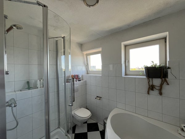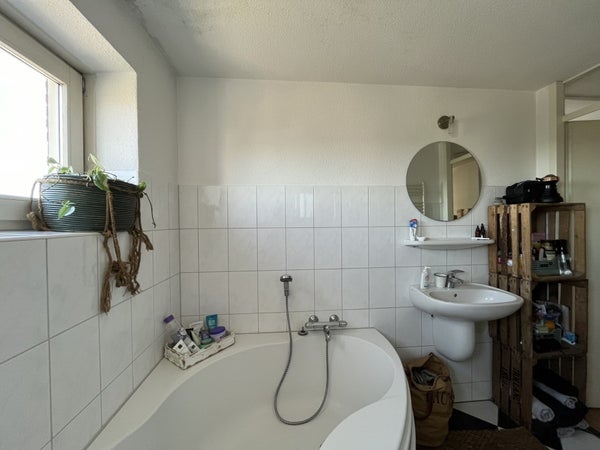 De badkamer is voorzien van een wastafel, toilet, design radiator, ligbad en aparte douche.