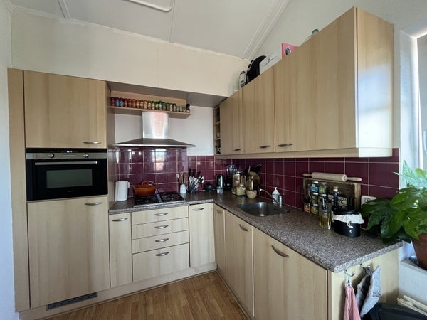 Indeling: hal, toilet met fonteintje, lichte woonkamer met open keuken voorzien van veel kastruimte. De keuken beschikt over en een afzuigkap, gaskookplaat, combi-magnetron, koelkast met vriesvak en vaatwasser. Vanuit de woonkamer betreed je het eerste balkon.