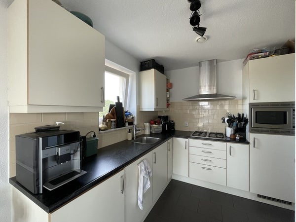 Indeling: hal, toilet met fonteintje, lichte woonkamer met open keuken voorzien van veel kastruimte. De keuken beschikt over en een afzuigkap, gaskookplaat, combi-magnetron, koelkast en vaatwasser. Vanuit de woonkamer betreed je het eerste balkon.