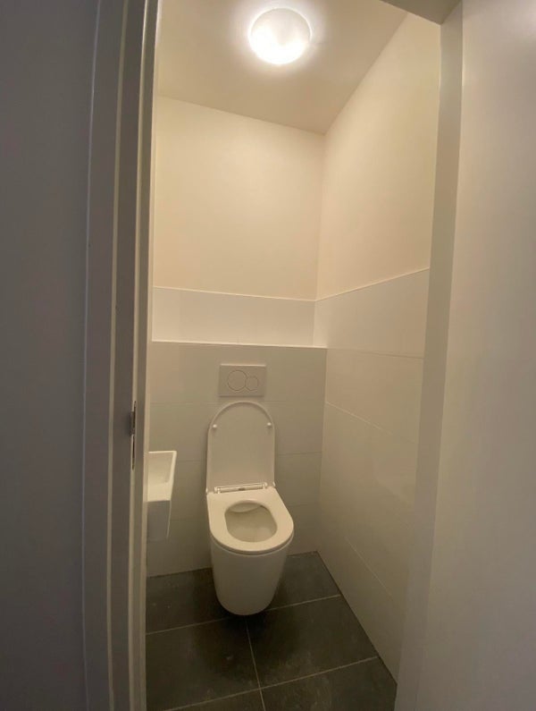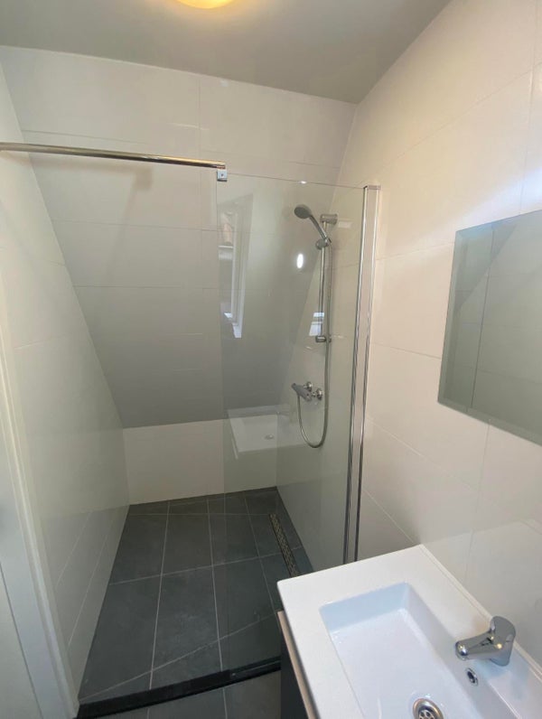 De luxe badkamer is voorzien van een douche, wastafel, spiegel met verlichting en een apart toilet.