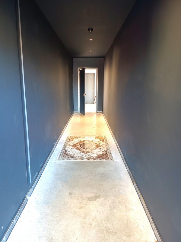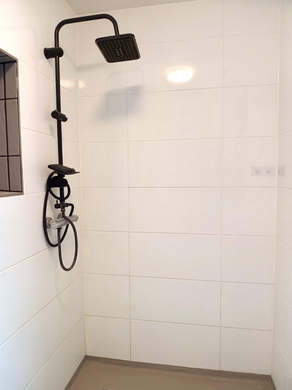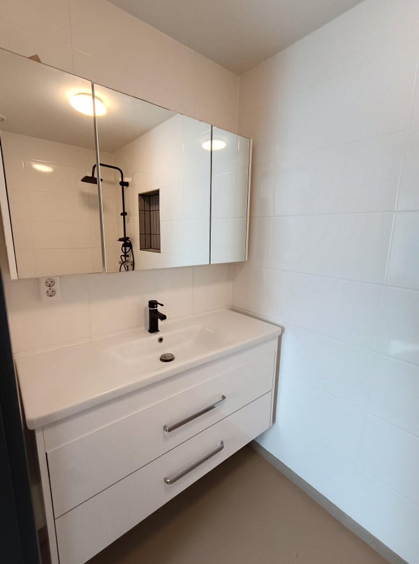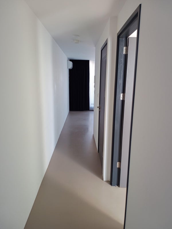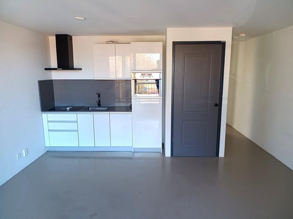 Je stapt via de voordeur binnen en komt in de centrale hal van de woning. De royale slaapkamer met badkamer. De badkamer is voorzien van een douche met thermostaatkraan en een badmeubel met spiegelkast. De volgende deur is van het toilet en aan het einde van de gang is de royale woonkamer met open keuken. De woonkamer is voorzien van een airconditioning die kan verwarmen en koelen, naast de elektrische vloerverwarming die de hele woning verwarmt.