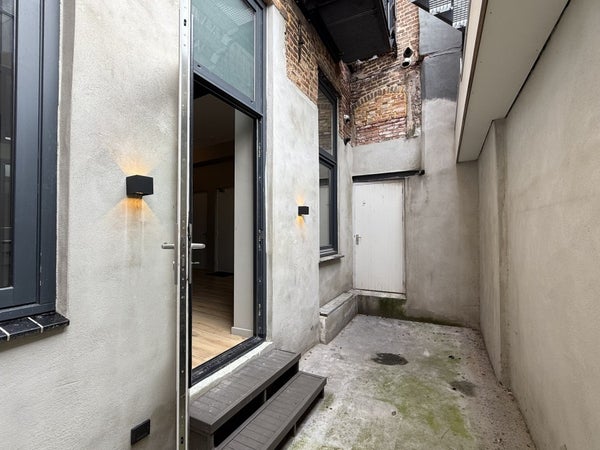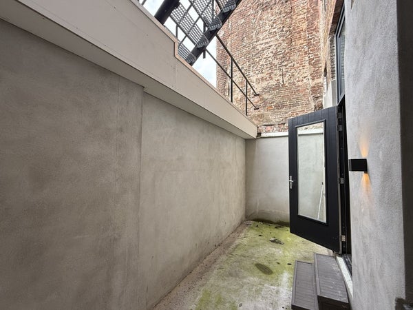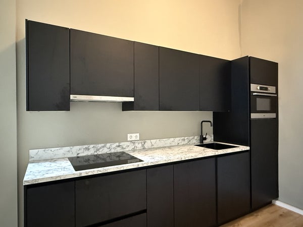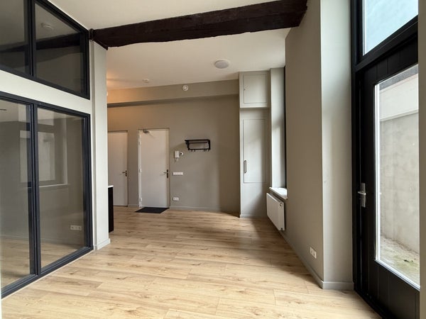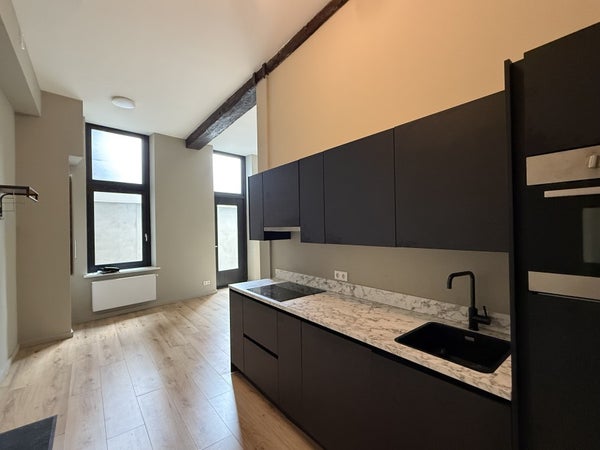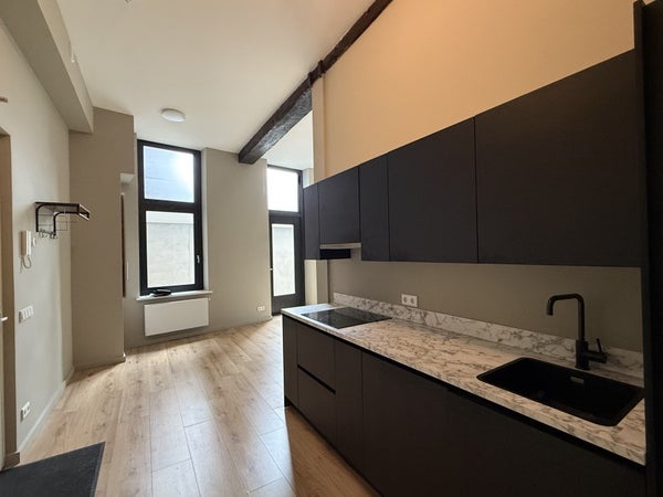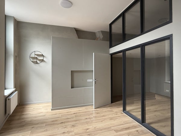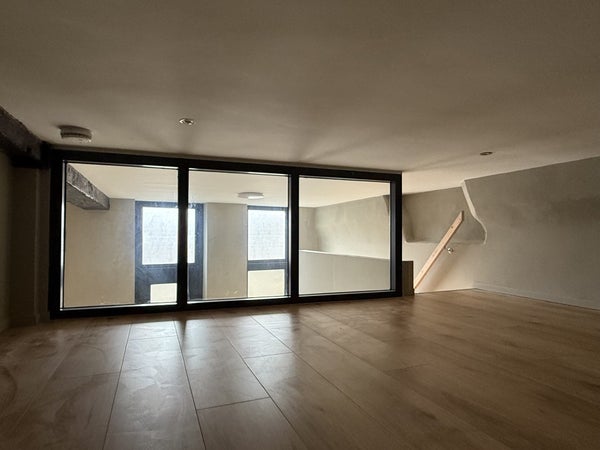 Met een plafondhoogte van maar liefst 3,50 meter, ervaar je direct een gevoel van ruimte en luxe. De moderne afwerking, gecombineerd met industriële zwarte stalen deuren, geeft het appartement een eigentijdse uitstraling.