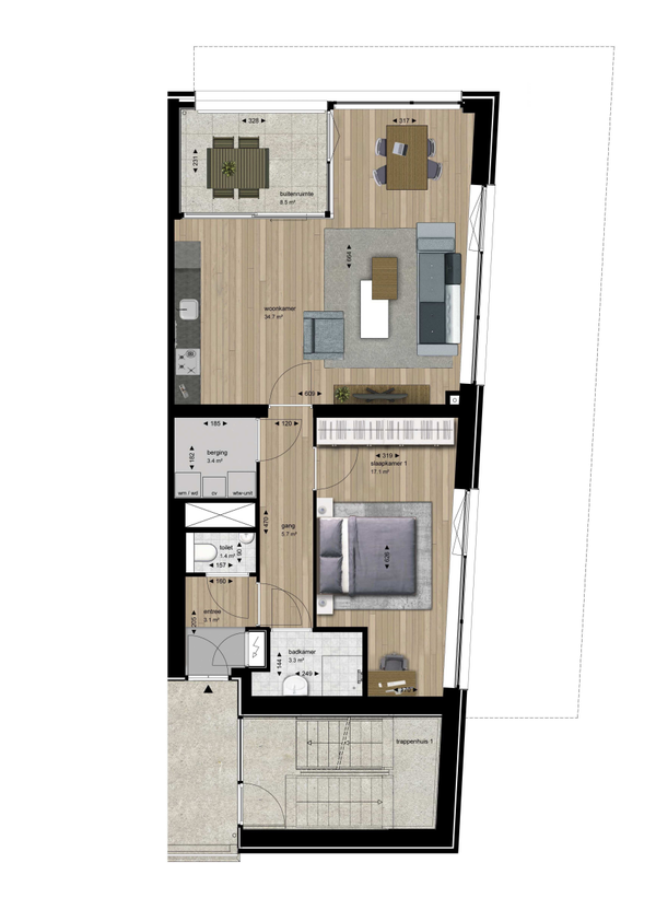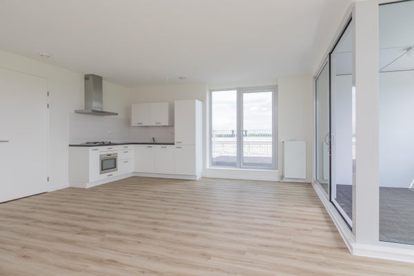 De lichte en ruime woonkamer valt op door de grote raampartijen, die zorgen voor veel natuurlijk daglicht. Via de schuifpui bereik je de ruime loggia, gelegen op het zuiden. Een heerlijke plek om te ontspannen of buiten te eten tijdens warme dagen.