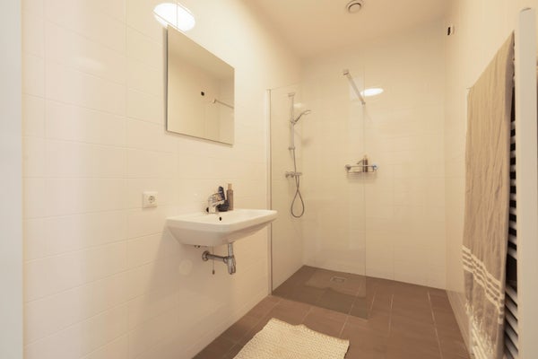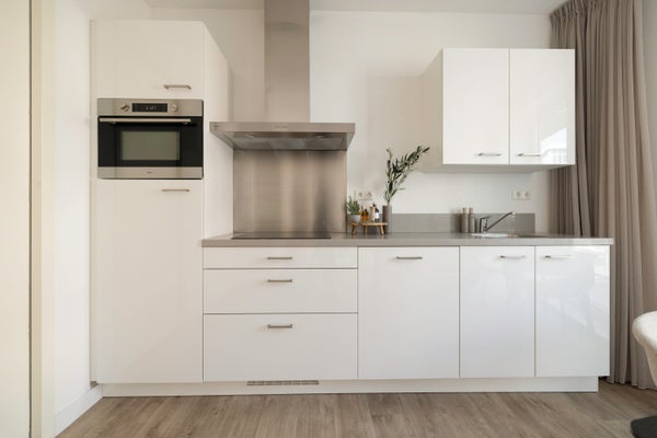 De moderne open keuken is uitgerust met veel kastruimte en inbouwapparatuur zoals een inductiekookplaat, afzuigkap, combi-oven/magnetron, koelkast en vaatwasser. Aangrenzend bevindt zich een ruime bijkeuken met aansluitingen voor wasmachine en droger en extra bergruimte. De strak afgewerkte badkamer is volledig betegeld en voorzien van een inloopdouche, wastafelmeubel en handdoek radiator. Het separate toilet beschikt over een fonteintje. De gehele woning is voorzien van comfortabele vloerverwarming, per ruimte regelbaar.