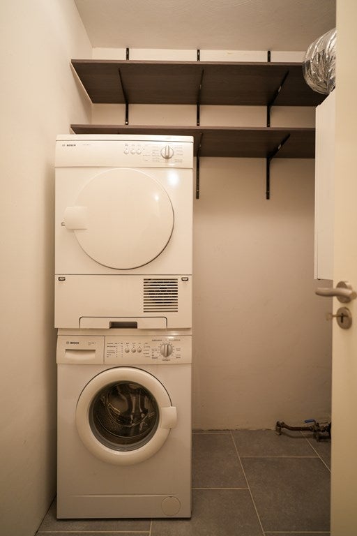 De inpandige bergruimte biedt ruimte voor wasmachine- en droger en is voorzien van stevige planken voor extra opslag. Deze bergruimte herbergt ook de HR CV ketel en de warmte-terugwin-installatie.