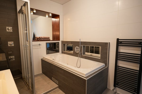 De luxe en moderne badkamer met ligbad, douchecel en toilet, is voorzien van alle gemakken. De vloer heeft een apart te regelen vloerverwarming. De wanden zijn volledig betegeld met fraaie brede tegels en twee grote spiegels in apart verlichte koven bekleed met warm hardhout.