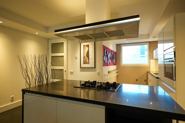 De grote zonnige woonkamer met open keuken en kamerhoge spiegels geeft een zeer ruimtelijk gevoel. Door een rondom verlaagd plafond met dimbare verlichting is de woonkamer prachtig indirect verlicht. Luxe kamerhoge gordijnen, geaccentueerd door de donkere vloer, geven de ruimte een intieme sfeer.