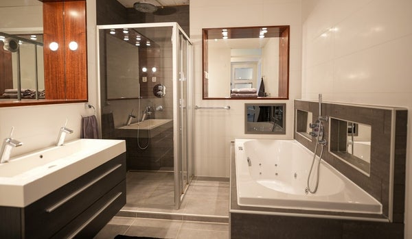 De riante douchecel biedt een regendouche, handdouche en zijstralers. Het ruime ligbad is voorzien van een jacuzzifunctie, extra handdouche en TV voor de ultieme ontspanning. Het wastafelmeubel biedt een tweepersoons waskom met twee kranen en een brede spiegel met spiegelverwarming. De verlichting is apart schakel- en dimbaar voor een prettige sfeer.