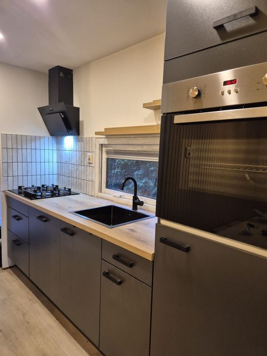 De moderne keuken is volledig uitgerust met vaatwasser, gaskookplaat, afzuigkap, spoelbak, koelkast met vriesvakje, oven en meerdere opberglades en kasten.