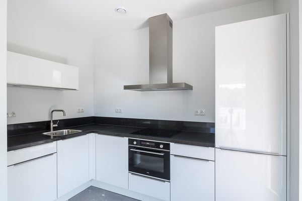 De keuken is voorzien van een composiet werkblad in de kleur zwart, inductie kookplaat, combimagnetron, koel-/vriescombinatie, afzuigkap en een vaatwasser.