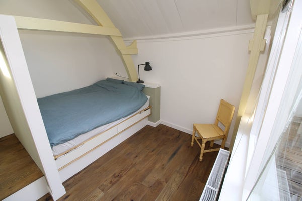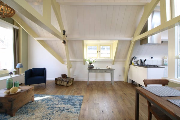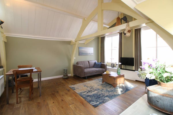 Het sfeervolle appartement beslaat ca. 56 m2 en heeft het idee van een Loft. Het beschikt over een ruime woonkamer met open keuken en daaraan grensend de open slaapkamer, De badkamer met douche en modern toilet is separaat gelegen.