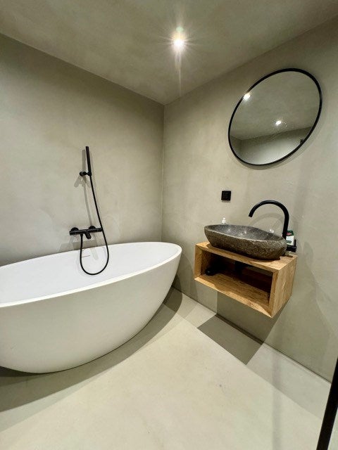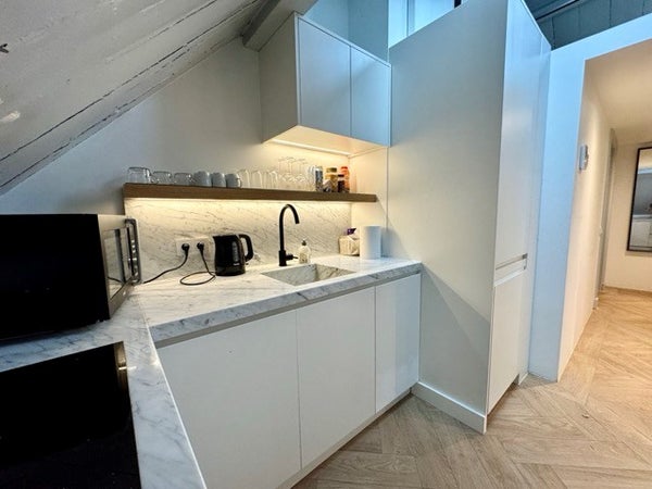 Het appartement bevindt zich op de 3e verdieping. De ruime woonkamer heeft een moderne, handgemaakte open keuken die volledig is uitgerust met hoogwaardige inbouwapparatuur, waaronder een combi-wasmachine/droger. De stijlvolle badkamer is voorzien van een inloopdouche, ligbad, toilet en wastafel. De zwarte kranen en betonvloer geven de ruimte een luxe, eigentijdse uitstraling.