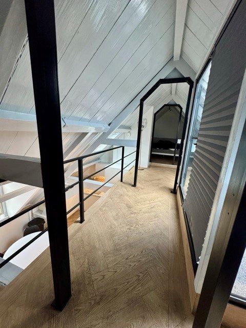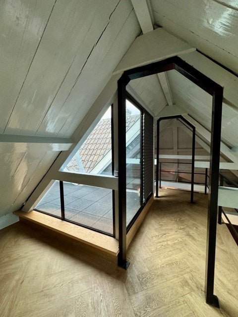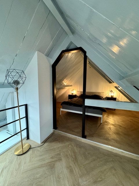 Grote ramen zorgen voor veel natuurlijk licht en creëren een lichte en open sfeer. De knusse slaapkamer bevindt zich boven in de loft, waardoor deze privé is maar toch verbonden blijft met de open leefruimte. Naast de slaapkamer bevindt zich de toegang tot het dakterras.