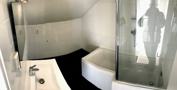 Badkamer (ca 2,55 x 1,90): met luxe hoekbad, glazen wand, wasmeubel, wasmachine aansluiting)