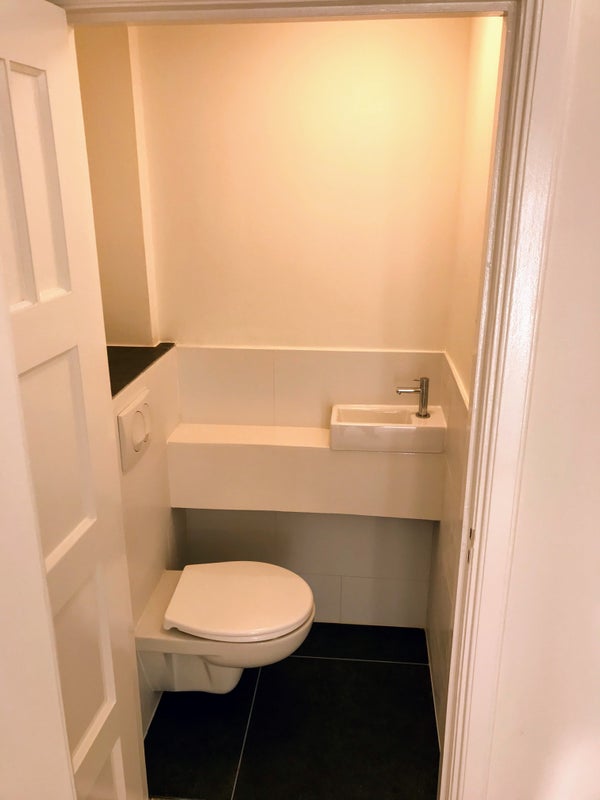 Toilet: gerenoveerd hangtoilet met witte wandtegel, donker plavuis en waskraantje