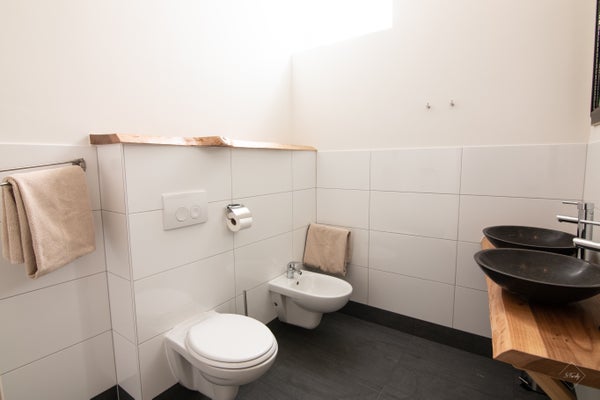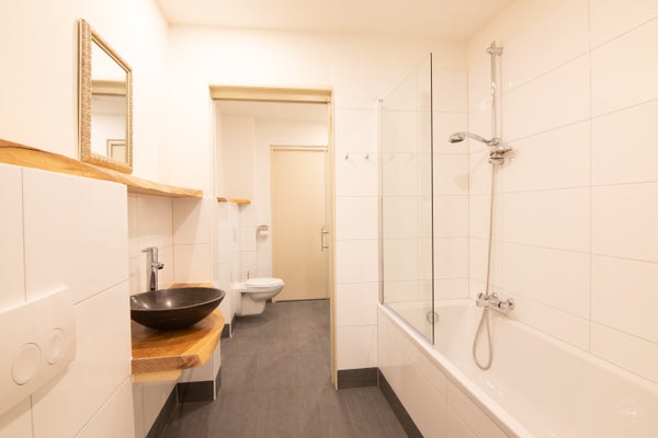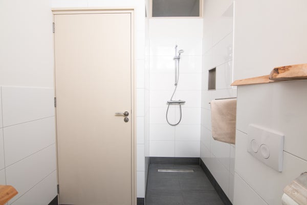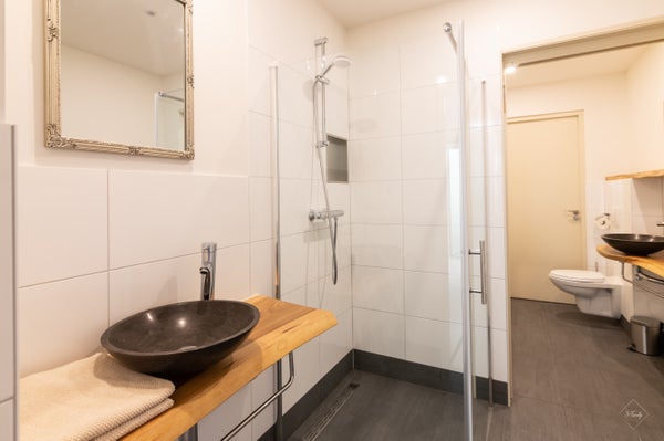 De en suite badkamers zijn volledig betegeld en beschikken over hoogwaardige kwaliteit. De badkamers hebben onder andere een inloopdouche, bad, toilet en een (dubbele) wastafel. Doormiddel van de lichte tegels en inbouw spots hebben de badkamers een unieke lichte uitstraling.