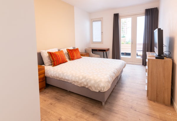 De 2e slaapkamer is ongeveer 15 m2 groot. De slaapkamer biedt tevens toegang tot de patio en een en suite badkamer met inloopdouche en toilet.