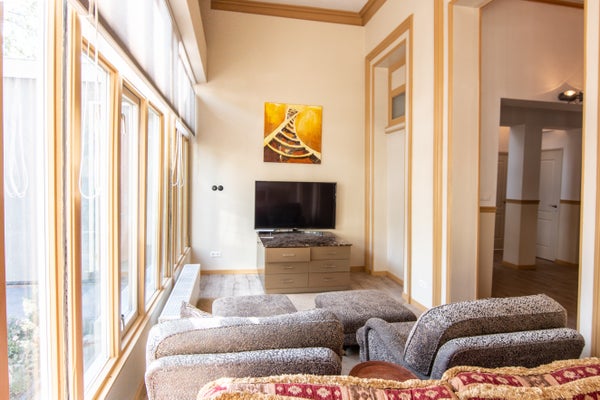 De woonkamer heeft veel raampartijen, waardoor er veel natuurlijk lichtinval is. Dit gecombineerd met de hoge plafonds zorgt voor een enorm ruimtelijk gevoel. De woonkamer is voorzien van een houten vloer, inbouw spots en hanglampen.
