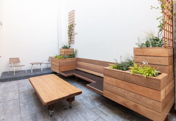Via twee slaapkamers is de modern opgestelde patio te bereiken. De patio is circa 22 m2 groot en heeft diverse zitjes.