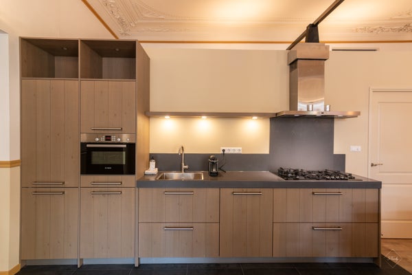 De moderne keuken is voorzien van diverse inbouwapparatuur zoals onder-bovenkasten, gasfornuis, afzuigkap, luxe mengkraan, koel-vriescombinatie, oven, vaatwasmachine en een granieten aanrechtblad.