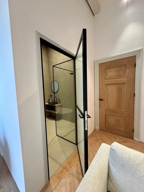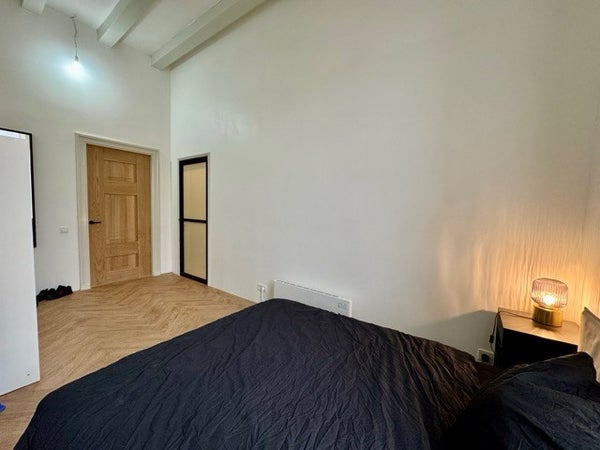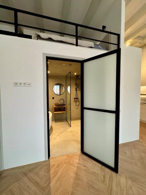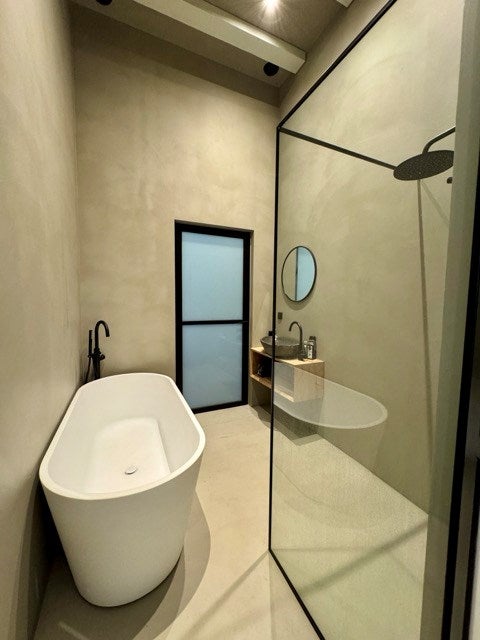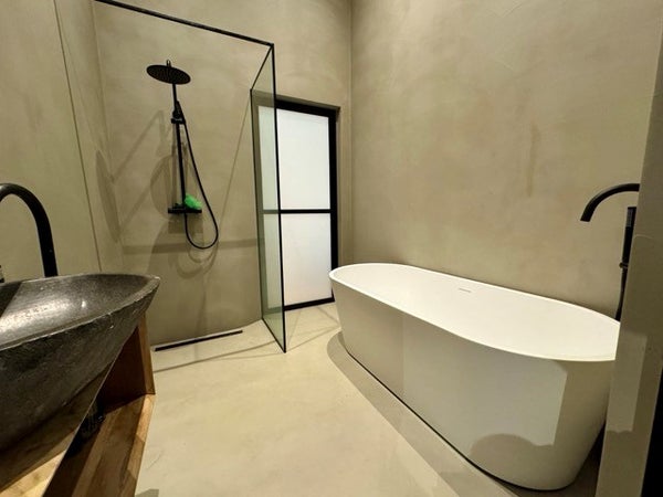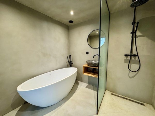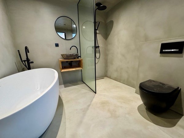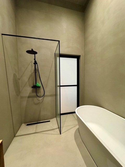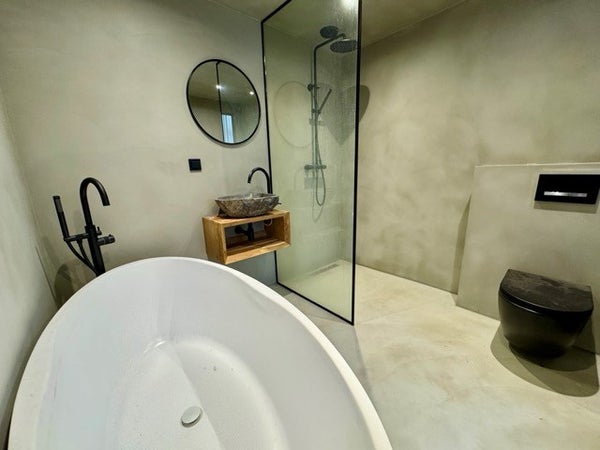 Een stijlvolle, moderne badkamer bedient zowel de slaapkamer als het woon- en eetgedeelte, met ingangen vanuit beide ruimtes. De badkamer is voorzien van een inloopdouche, ligbad, toilet, wastafel met strakke zwarte kranen, een combi-was-droogmachine en een gepolijste betonvloer, wat bijdraagt aan een luxe, eigentijdse uitstraling.