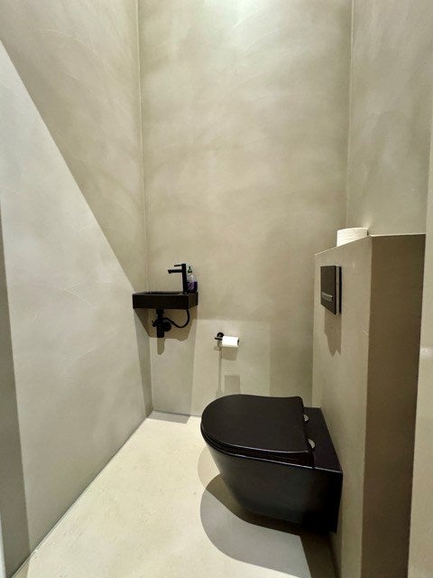 Aan de linkerkant van de woonkamer bevindt zich een berging en de tweede badkamer. Deze badkamer is voorzien van een inloopdouche, ligbad, toilet, wastafel met strakke zwarte kranen, een combi-was-droogmachine en een gepolijste betonvloer, wat een luxe, moderne uitstraling geeft. Naast de badkamer leidt een trap naar een hoger gelegen leefruimte.