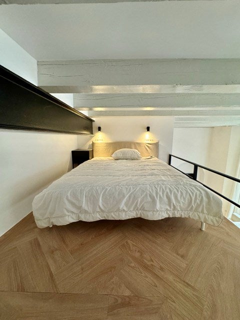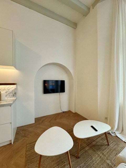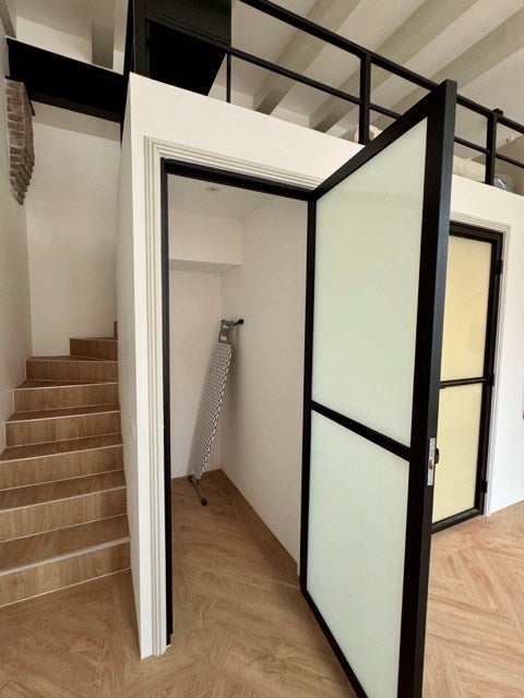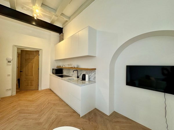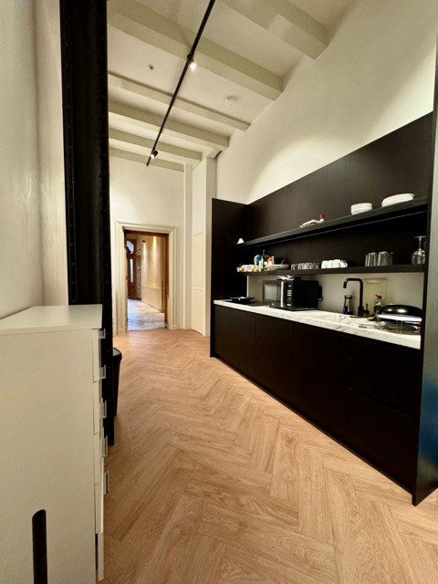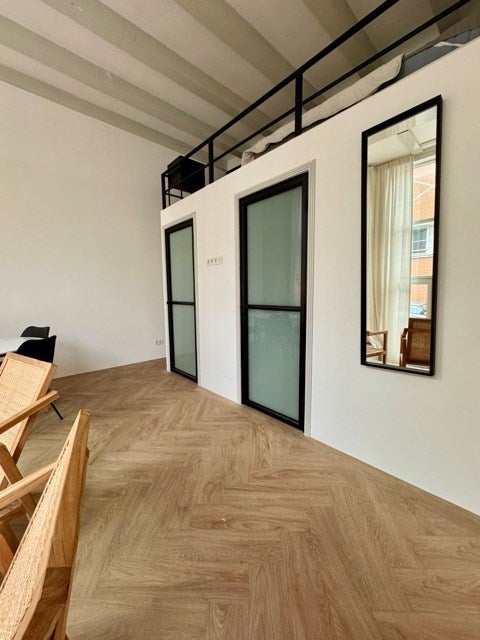De eerste deur rechts van de eerste keuken leidt naar de slaapkamer, met een groot raam dat de kamer vult met natuurlijk licht. De tweede deur rechts van de keuken opent naar de tweede keuken en het eetgedeelte, eveneens met grote ramen en een lichte, open sfeer.
