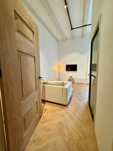 De eerste deur links van de keuken leidt naar de ruime woonkamer, met een tweede moderne, handgemaakte open keuken, volledig uitgerust met hoogwaardige inbouwapparatuur. Achter de woonkamer bevindt zich een gezellige eetruimte. Grote ramen vullen de woning met natuurlijk licht en bieden prettig uitzicht op de straat.