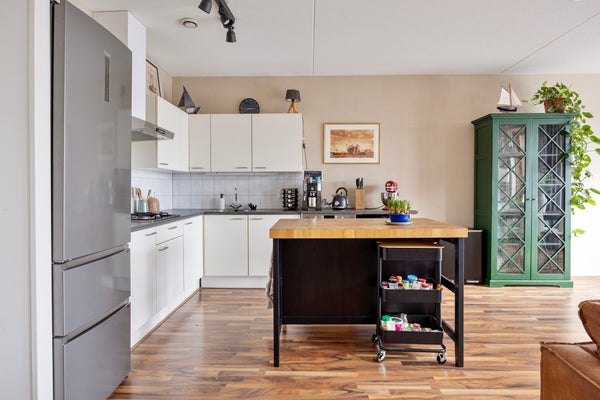 Aan het einde van de hal bereikt u de royale woonkamer, die dankzij de grote raampartijen geniet van veel natuurlijk lichtinval. Aangrenzend bevindt zich de hoekkeuken, uitgerust met een koel-vriescombinatie, gasfornuis, vaatwasser en voldoende opbergruimte.