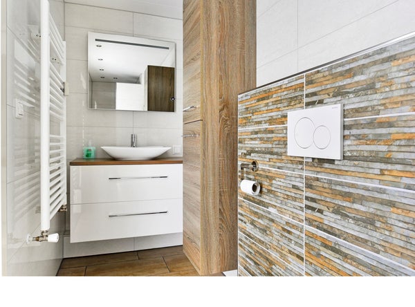 Luxe badkamer, met wandcloset, inloopdouche met thermostaatkraan en wastafelmeubel met verwarmde spiegel. Afwerking middels lichte wandtegels en zandkleurige vloertegels.