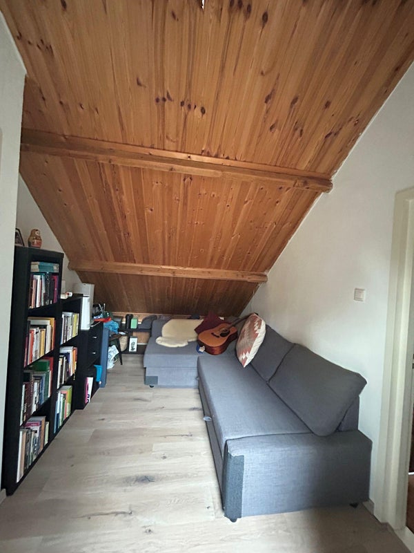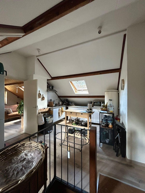 De trap leidt naar de open keuken, die over de volle breedte van het pand is gesitueerd. Vanuit de keuken heeft u toegang tot de ruime woonkamer (ca. 25 m²), een lichte slaapkamer, een extra kamer en de badkamer met toilet.
