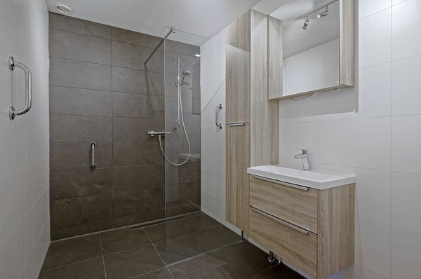 Toiletruimte met hangend toilet en fontein. Badkamer met inloopdouche, wastafelmeubel, designradiator en aansluiting voor de wasmachine.