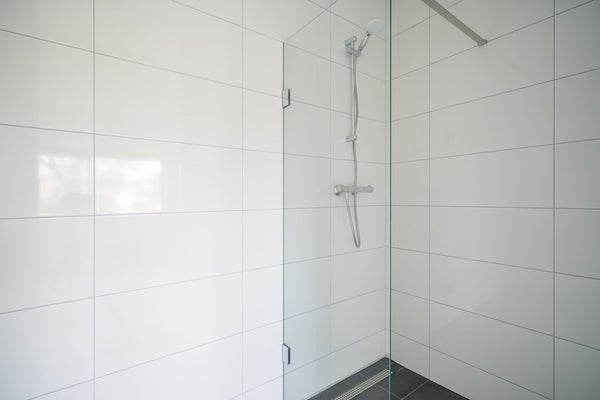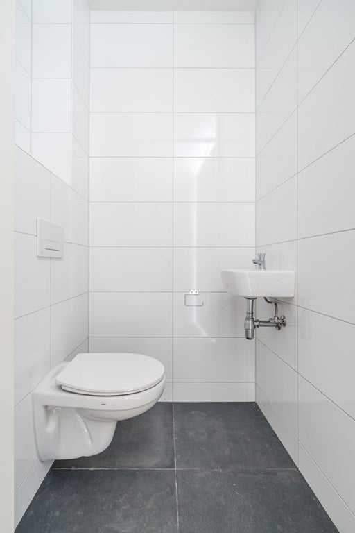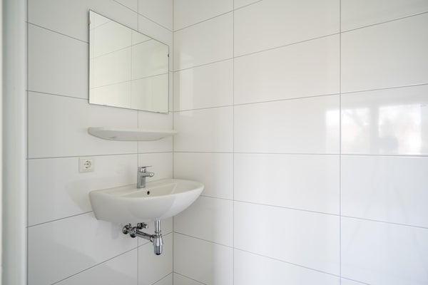 De badkamer is voorzien van keramische tegels in de kleur antraciet, wastafel met bijpassend planchet en een spiegel. Het toilet is separaat.