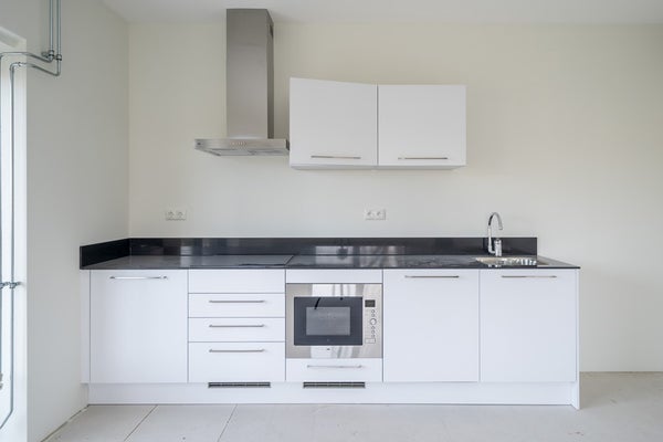De keuken is voorzien van een composiet werkblad in de kleur zwart, keramische kookplaat, combimagnetron, koelkast, afzuigkap en een vaatwasser.
