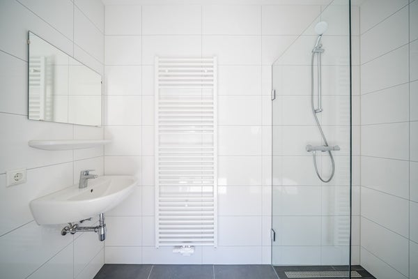 De badkamer is voorzien van keramische tegels in de kleur antraciet, wastafel met bijpassend planchet en een spiegel. Het toilet is separaat.