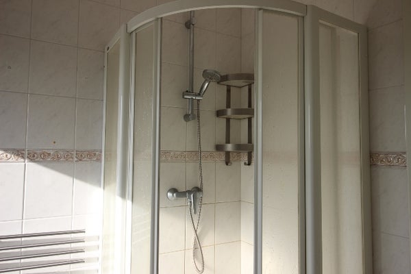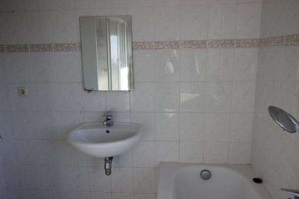 De geheel betegelde badkamer beschikt over een ligbad, douche en een wastafel.
