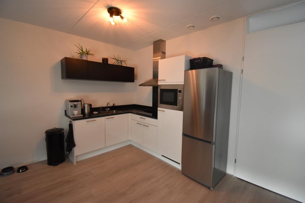 De woonkamer met open keuken die is voorzien van een koel-vriescombinatie, combimagnetron, inductie kookplaat, afzuigkap en vaatwasser. De woonkamer is voorzien van grote raampartijen met naar binnen draaiende draai-kiepramen waardoor de ruimte heerlijk licht is.