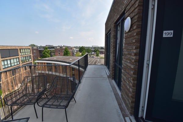 Het appartement ligt op de 3e verdieping. De balkons (op het noordwesten gelegen) van dit complex grenzen aan de galerij, dus je kunt bij goed weer toch lekker buiten zitten.