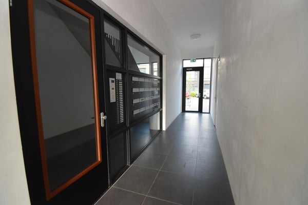 Aan de achterzijde van het pand bevindt zich de centrale ingang van dit appartementencomplex. De parkeerplaats is bereikbaar via een slagboom die middels kentekenregistratie opent. Via de gezamenlijke voordeur stap je de hal binnen. Hier bevinden zich de brievenbussen, het trappenhuis en de lift. De inpandige berging kun je ook via de hal bereiken.