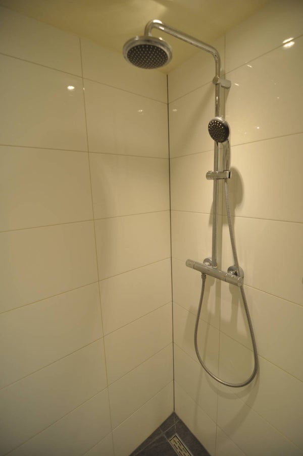 De douche/toiletruimte is praktisch ingericht voorzien van een hangtoilet en (regen)douche.