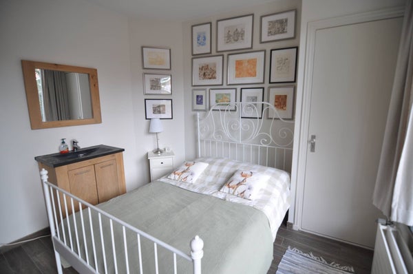 De slaapkamer is gelegen aan de achterzijde en is voorzien van wastafel, 2 persoonsbed en voldoende kastruimte.