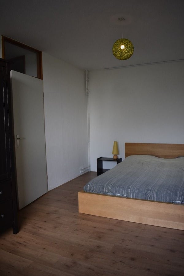 Ruime slaapkamer welke voorzien is van een nette laminaatvloer en toegang biedt tot het balkon.