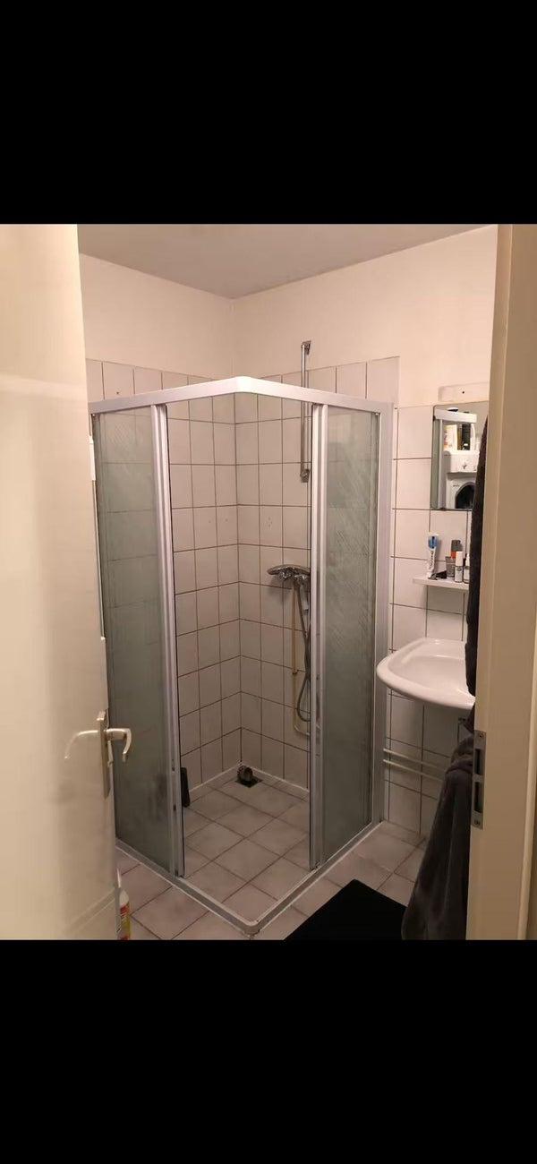 Nette badkamer voorzien van douche, wastafelmeubel en spiegel. Modern afgewerkt en goed onderhouden.